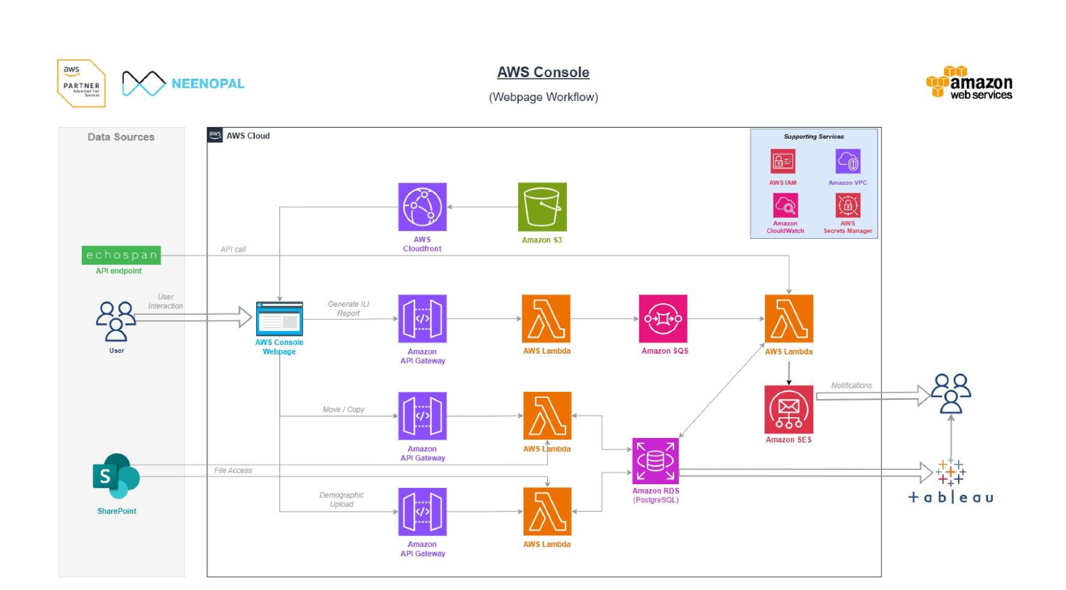 To overcome these challenges, NeenOpal implemented a robust, cloud-based data infrastructure designed for scalability, automation, and real-time insights. The solution combined advanced AWS services with Tableau integration to create a seamless reporting and analytics ecosystem.